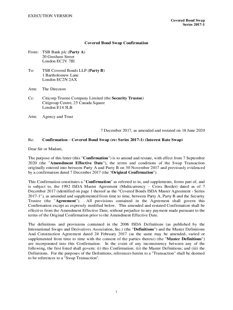 EXECUTION VERSION Covered Bond Swap Series 20171Covered Bond Swap Confirmation From: TSB Bank plc (Party A) 20 Gresham Street London EC2V 7IE To:TSB Covered Bonds LLP (Party B) 1 Bartholomew Lane