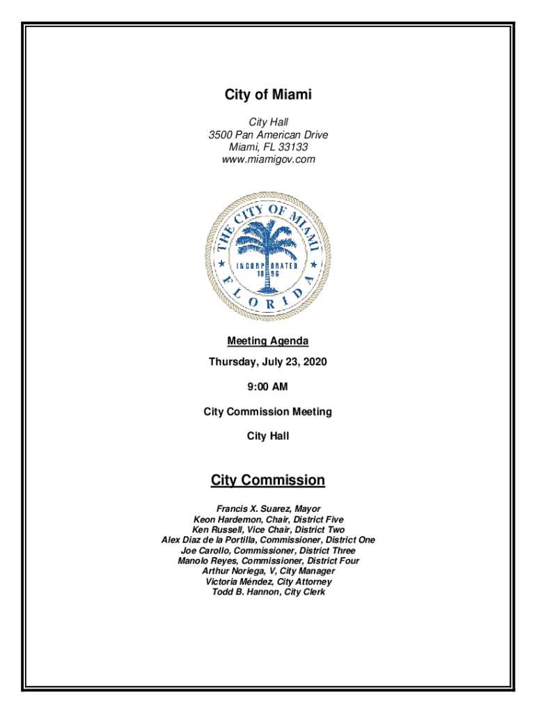 City of Miami City Hall 3500 Pan American Drive Miami, FL 33133 www.miamigov.comMeeting Agenda Thursday, July 23, 2020 9:00 AM City Commission Meeting City Helicity Commission Francis X. Suarez, Mayor