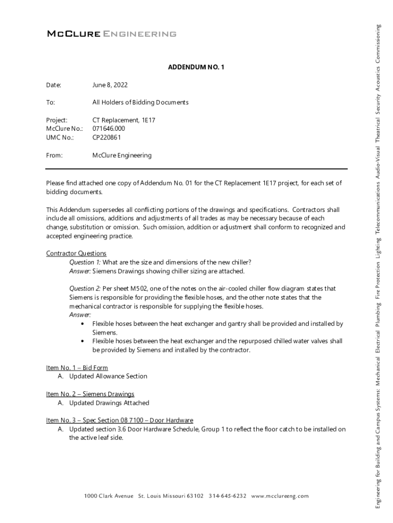 ADDENDUM NO. 1 Date:June 8, 2022To:All Holders of Bidding DocumentsProject: McClure No.: UMC No.:CT Replacement, 1E17 071646.000 CP220861From:McClure EngineeringPlease find attached one copy of Addendum