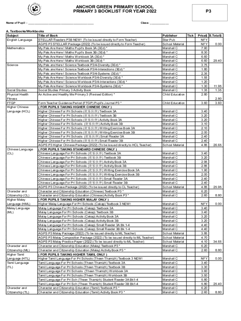 Get the free ANCHOR GREEN PRIMARY SCHOOL PRIMARY 3 BOOKLIST FOR ...