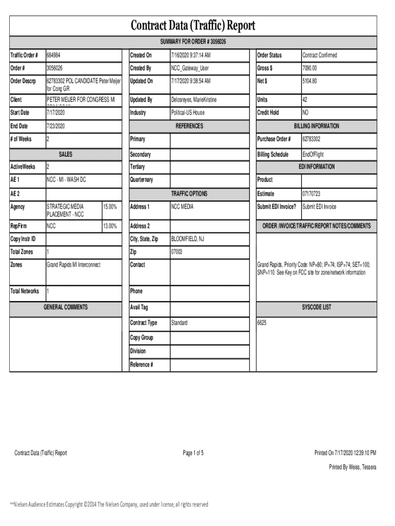 Contract Data (Traffic) Report SUMMARY FOR ORDER # 3056026 Traffic Order #684984Created On7/16/2020 9:37:14 Order StatusContract ConfirmedOrder #3056026Created ByNCC_Gateway_UserGross $7090.00Order