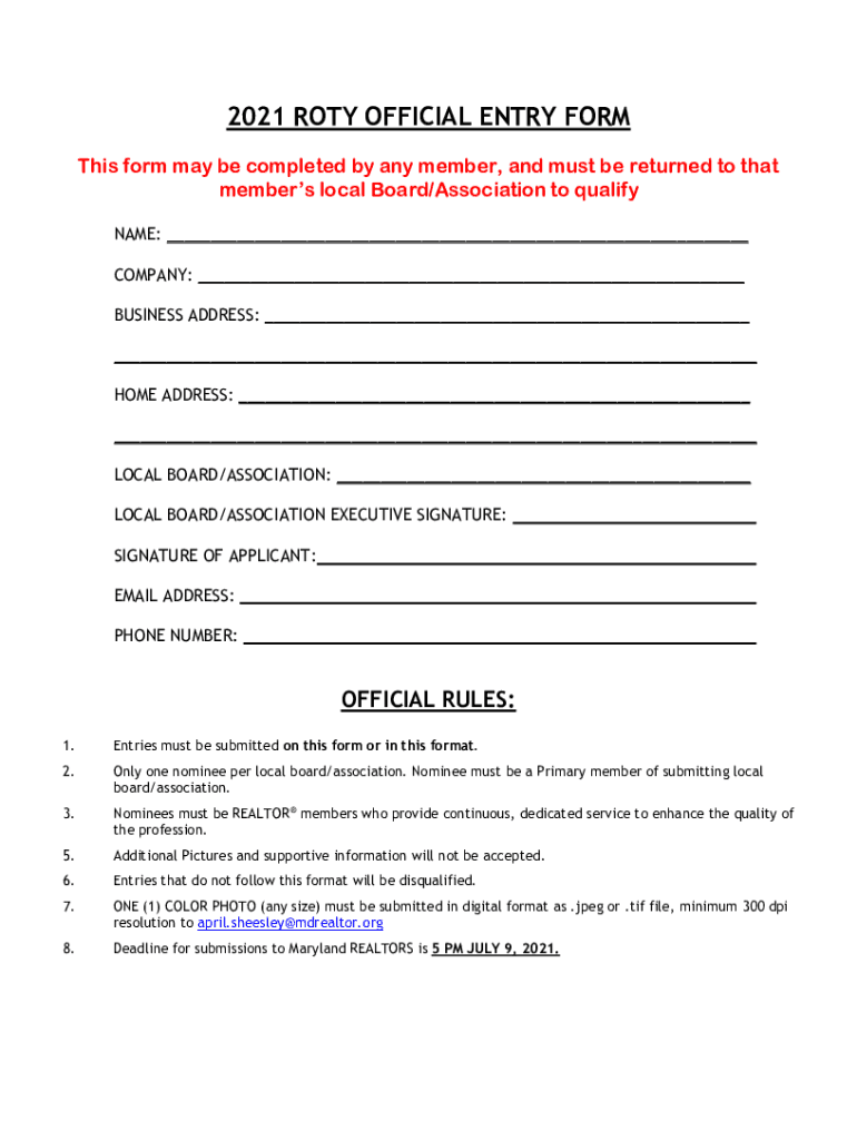 REALTOR THEREAT Official Entry Form 2021 IMPORTANT NOTE When filling out this form take care to not use any identifiers (area, city, location, proper nouns) that could be used to determine a candidates'