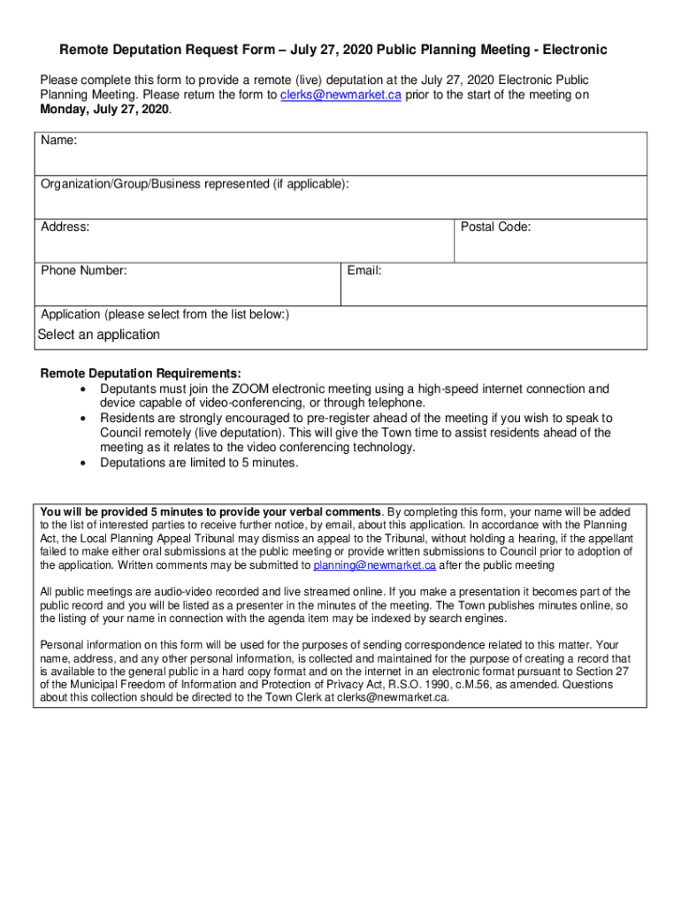 Remote Deputation Request Form July 27, 2020, Public Planning Meeting Electronic Please complete this form to provide a remote (live) deputation at the July 27, 2020, Electronic Public Planning Meeting.