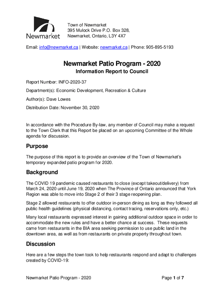 Town of Newmarket 395 Mulock Drive P.O. Box 328, Newmarket, Ontario, L3Y 4×7 Email: info@newmarket.ca | Website: Newmarket.ca | Phone: 9058955193Newmarket Patio Program 2020 Information Report to