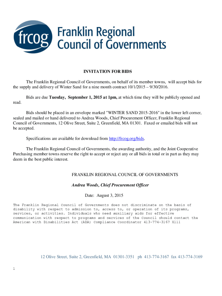 INVITATION FOR BIDS The Franklin Regional Council of Governments, on behalf of its member towns, will accept bids for the supply and delivery of Winter Sand for a nine-month contract 10/1/2015 9/30/2016.