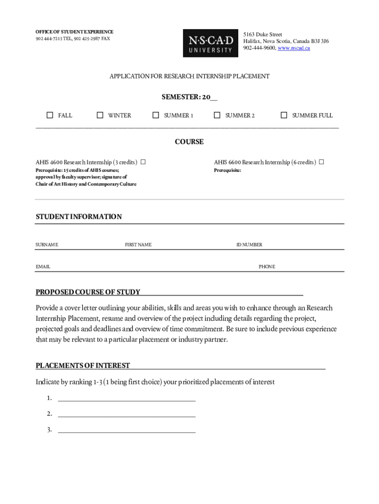OFFICE OF STUDENT EXPERIENCE 902 4447213 TEL, 902 4252987 FAX5163 Duke Street Halifax, Nova Scotia, Canada B3J 3J6 9024449600, www.nscad.caAPPLICATION FOR RESEARCH INTERNSHIP PLACEMENTSEMESTER: 20__