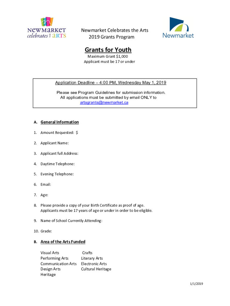 Newmarket Celebrates the Arts 2019 Grants ProgramGrants for Youth Maximum Grant $1,000 Applicant must be 17 or underApplication Deadline 4:00 PM, Wednesday, May 1, 2019, Please see Program Guidelines
