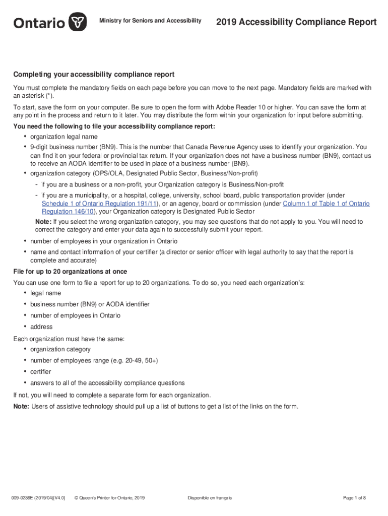 Ministry for Seniors and Accessibility2019 Accessibility Compliance ReportCompleting your accessibility compliance report You must complete the mandatory fields on each page before you can move to