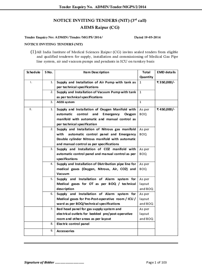 Tender Inquiry No. ADMIN/Tender/MAPS/2/2014NOTICE INVITING TENDERS (NIT) (3rd call) AIMS Raipur (CG) Tender Inquiry No: ADMIN/Tender/MAPS/2014/Dated 19052014NOTICE INVITING TENDERS (NIT)(1) All India