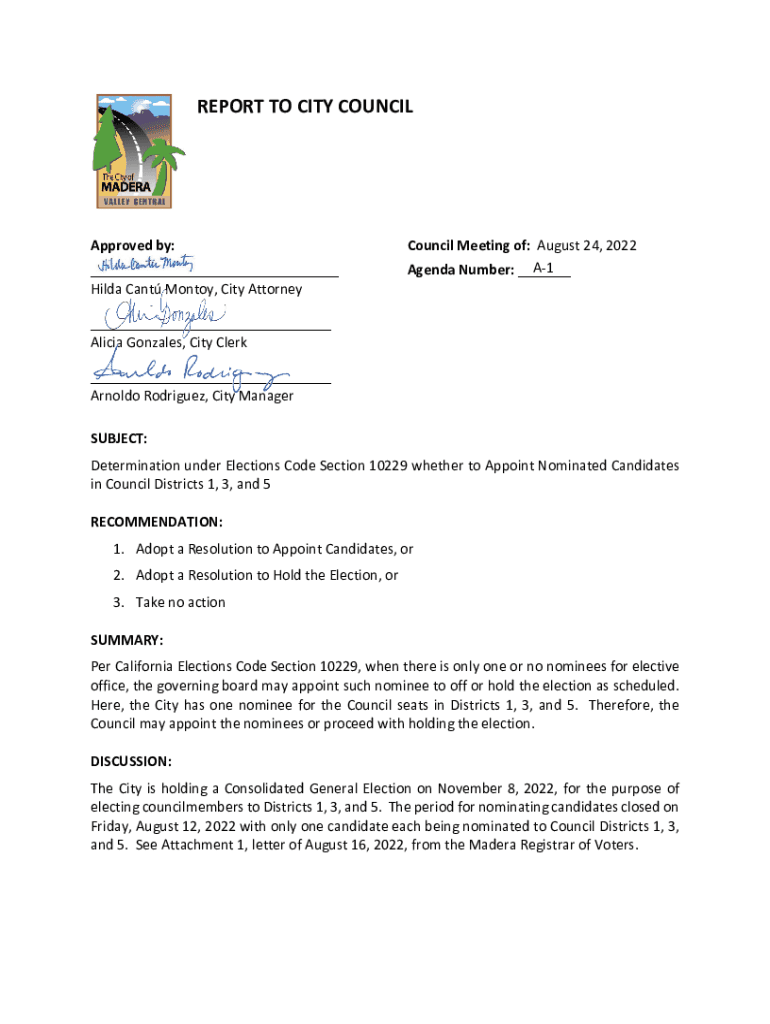 REPORT TO CITY COUNCILApproved by: ___ Hilda Can't Montoya, City AttorneyCouncil Meeting of: August 24, 2022 A1 Agenda Number: ___ ______ Alicia Gonzales, City Clerk ___ Arnold Rodriguez, City Manager