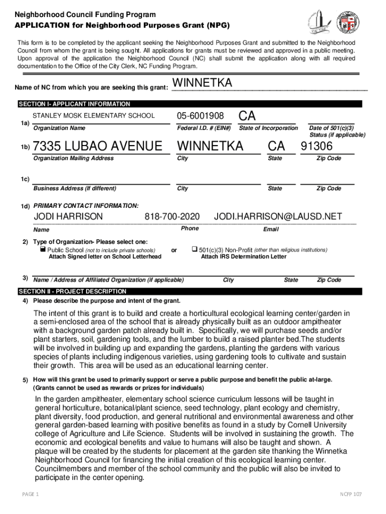 Neighborhood Council Funding Program APPLICATION for Neighborhood Purposes Grant (NPG) This form is to be completed by the applicant seeking the Neighborhood Purposes Grant and submitted to the Neighborhood