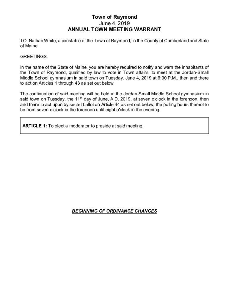 Town of Raymond June 4, 2019, ANNUAL TOWN MEETING WARRANT TO: Nathan White, a constable of the Town of Raymond, in the County of Cumberland and State of Maine. GREETINGS: In the name of the State