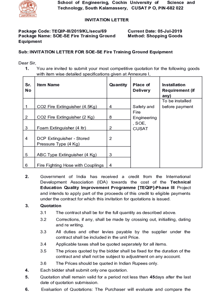 School of Engineering, Cochin University of Science and Technology, South Lamasery, CU SAT P O, PIN682 022 INVITATION LETTER Package Code: TEQIPIII/2019/KL/sect/69 Package Name: SOUSE Fire Training