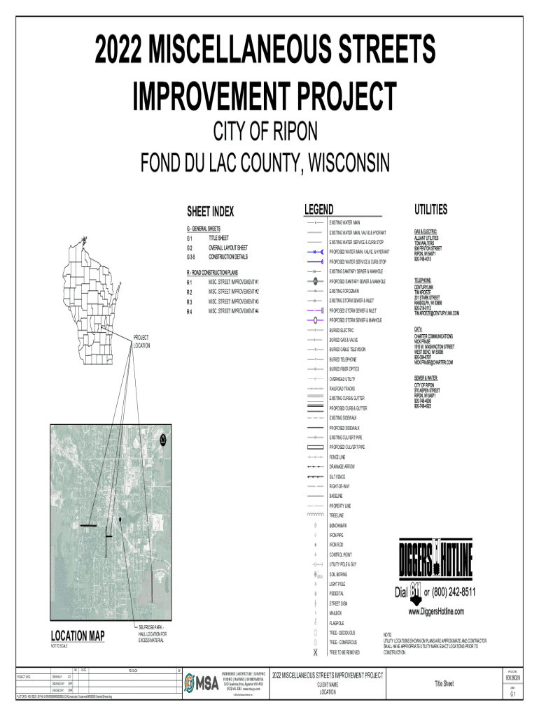 2022 MISCELLANEOUS STREETS IMPROVEMENT PROJECT CITY OF RIPEN FOND DU LAC COUNTY, WISCONSIN SHEET INDEXLEGENDG GENERAL SHEETS TITLE SHEET G1 OVERALL LAYOUT SHEET G2 CONSTRUCTION DETAILS G 35 R ROAD