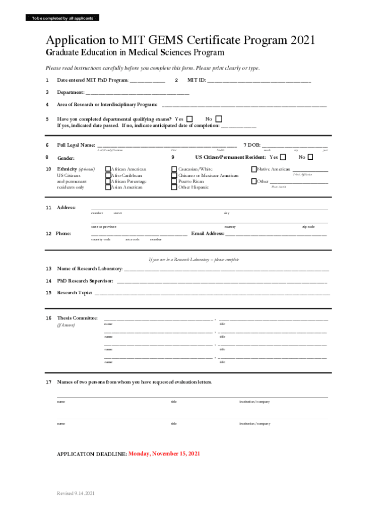 To be completed by all applicantsApplication to MIT GEMS Certificate Program 2021 Graduate from Education in Medical Sciences Program Please read instructions carefully before you complete this form.