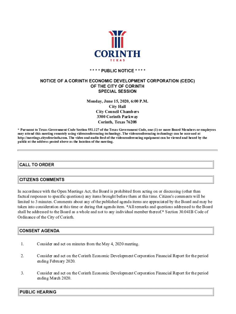 * * * * PUBLIC NOTICE * * * * NOTICE OF A CORINTH ECONOMIC DEVELOPMENT CORPORATION (CDC) OF THE CITY OF CORINTH SPECIAL SESSION Monday, June 15, 2020, 6:00 P.M. City Hall City Council Chambers 3300