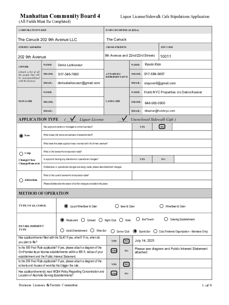 Manhattan Community Board 4Liquor License/Sidewalk Café Stipulations Application(All Fields Must Be Completed) CORPORATION NAMING BUSINESS AS (DBA)The Canuck 202 9th Avenue Lathe Backstreet ADDRESS