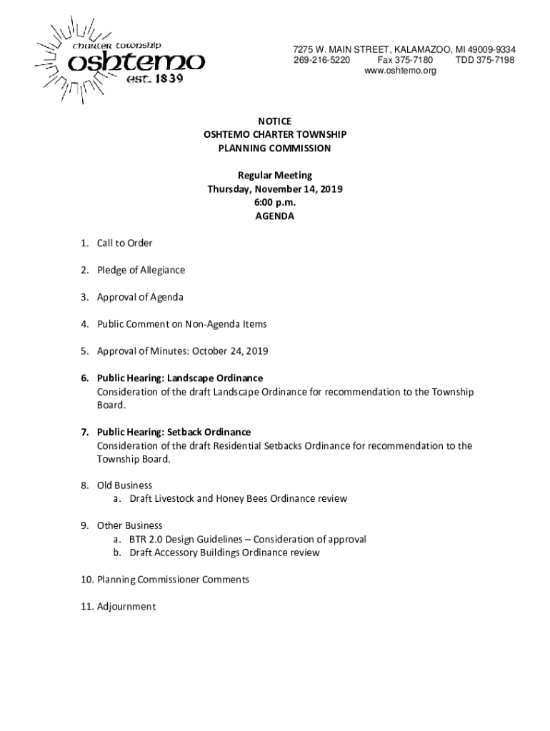 7275 W. MAIN STREET, KALAMAZOO, MI 490099334 2692165220 Fax 3757180 TDD 3757198 www.oshtemo.orgNOTICE STEM CHARTER TOWNSHIP PLANNING COMMISSION Regular Meeting Thursday, November 14, 2019 6:00 p.m.