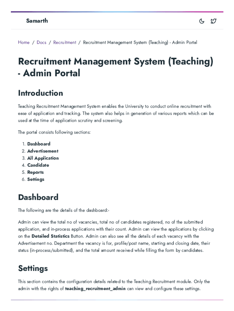 Smart Home / Docs / Recruitment / Recruitment Management System (Teaching) Admin PortalRecruitment Management System (Teaching) Admin Portal Introduction Teaching Recruitment Management System enables