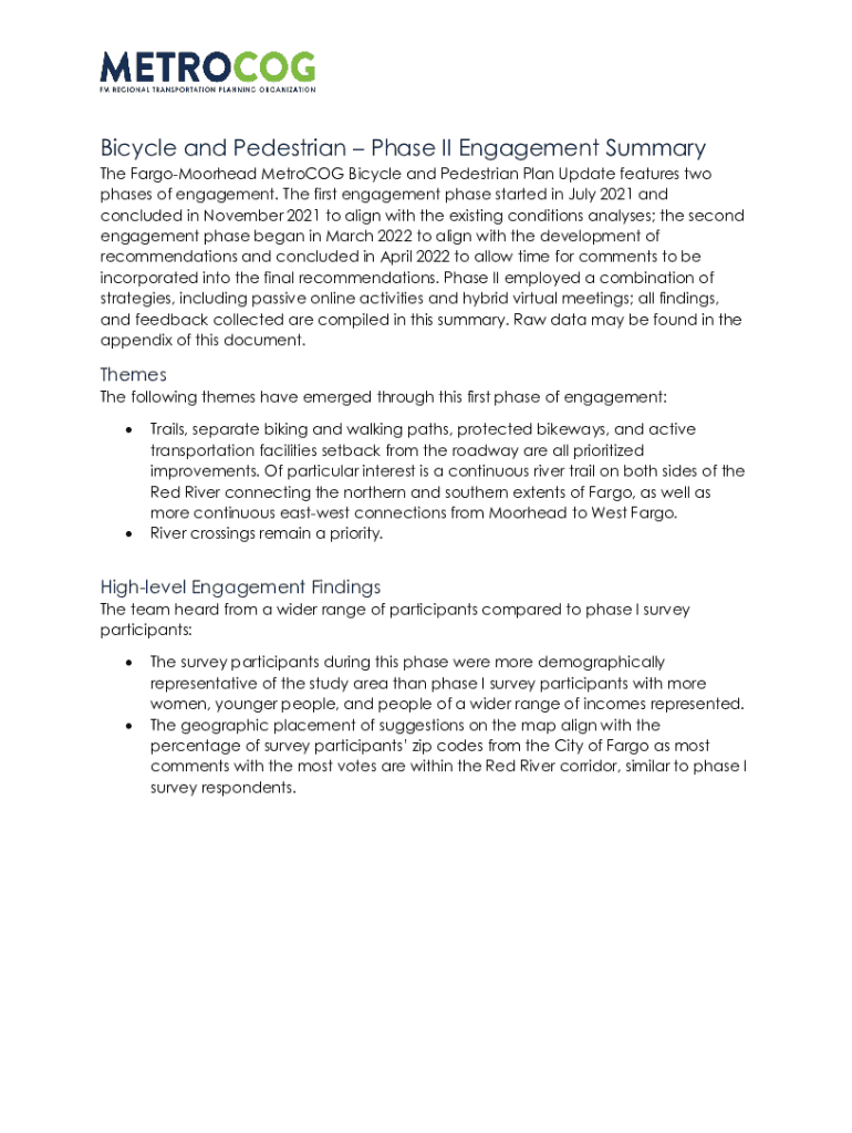 Bicycle and Pedestrian Phase II Engagement Summary FargoMoorhead Metro COG Bicycle and Pedestrian Plan Update features two phases of engagement. The first engagement phase started in July 2021 and