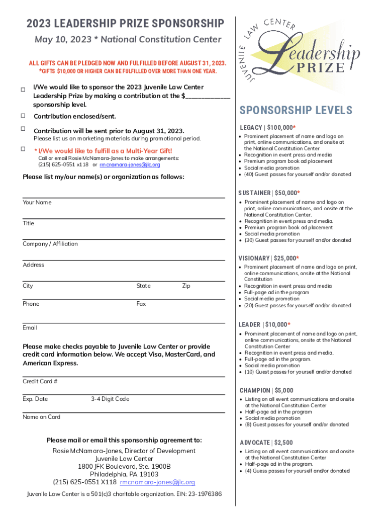 2023 Leadership prize SPONSORSHIP May 10, 2023 * National Constitution Center ALL GIFTS CAN BE PLEDGED NOW AND FULFILLED BEFORE AUGUST 31, 2023. *GIFTS $10,000 OR HIGHER CAN BE FULFILLED OVER MORE