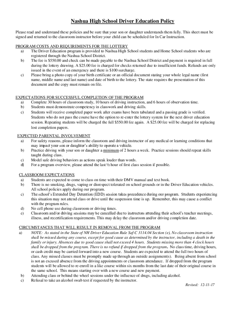 Get the free Nashua High School Driver Education Policy
