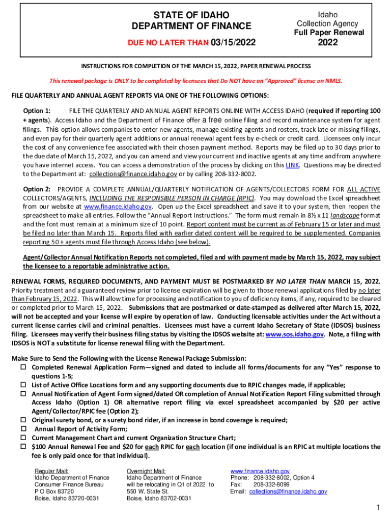 STATE OF IDAHO DEPARTMENT OF FINANCE Idaho Collection Agency Full Paper Renewable NO LATER THAN 03/15/20222022INSTRUCTIONS FOR COMPLETION OF THE MARCH 15, 2022, PAPER RENEWAL PROCESS This renewal