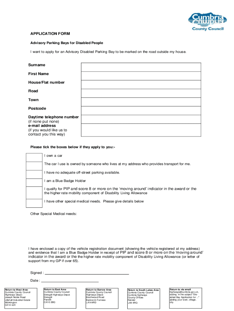 Get the free Application form for advisory parking bays for disabled people
