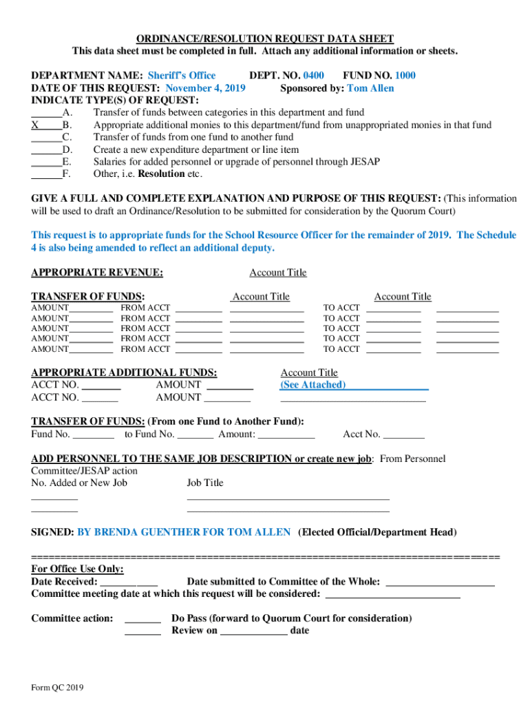 ORDINANCE/RESOLUTION REQUEST DATA SHEET This data sheet must be completed in full. Attach any additional information or sheets. DEPARTMENT NAME: Sheriffs Office DEPT. NO. 0400 FUND NO. 1000 DATE OF