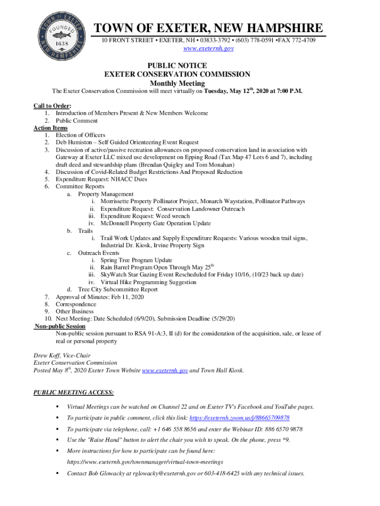 TOWN OF EXE TER, NEW HAMPSHIRE 10 FRONT STREET EXE TER, NH 038333792 (603) 7780591 FAX 7724709www.eastern.nonpublic NOTICE EXE TER CONSERVATION COMMISSION Monthly Meeting The Peter Conservation Commission