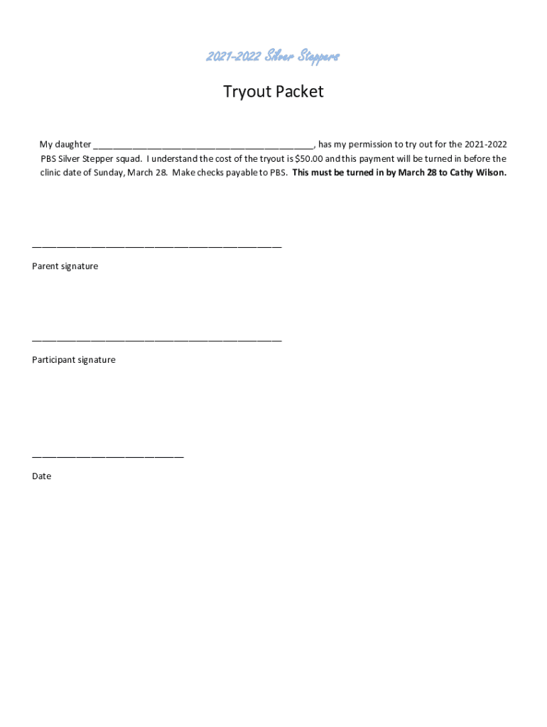20212022 Silver Steppers Tryout Packet My daughter ___, has my permission to try out for the 20212022 PBS Silver Stepper squad. I understand the cost of the tryout is $50.00 and this payment will