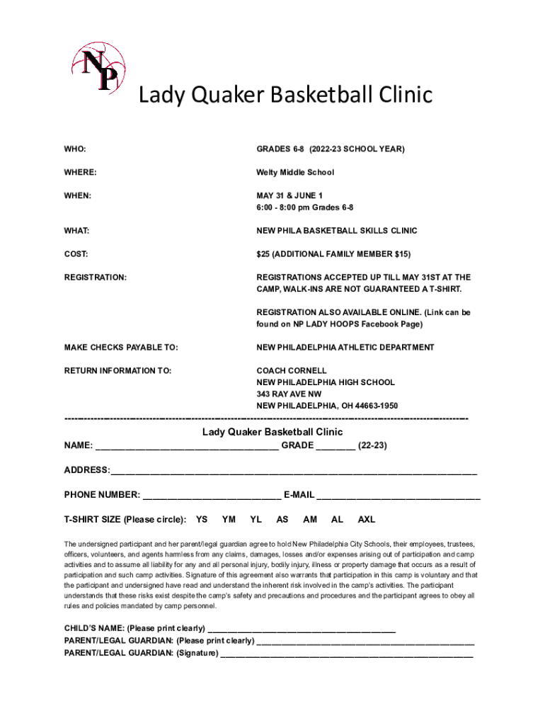 Lady Quaker Basketball Clinic WHO:GRADES 68 (202223 SCHOOL YEAR)WHERE:Welt Middle Schooled:MAY 31 & JUNE 1 6:00 8:00 pm Grades 68WHAT:NEW PHIL BASKETBALL SKILLS CliniCast:$25 (ADDITIONAL FAMILY MEMBER