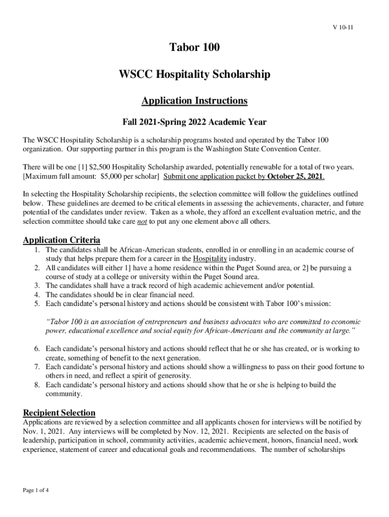 V 1011Tabor 100 SCC Hospitality Scholarship Application Instructions Fall 2021Spring 2022 Academic Year The SCC Hospitality Scholarship is a scholarship programs hosted and operated by the Tabor 100