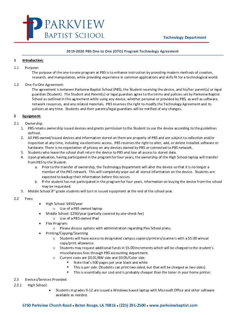 Technology Department 20192020 PBS One to One (OTO) Program Technology Agreement 1Introduction:1.1Purpose: The purpose of the Antoine program at PBS is to enhance instruction by providing modern methods