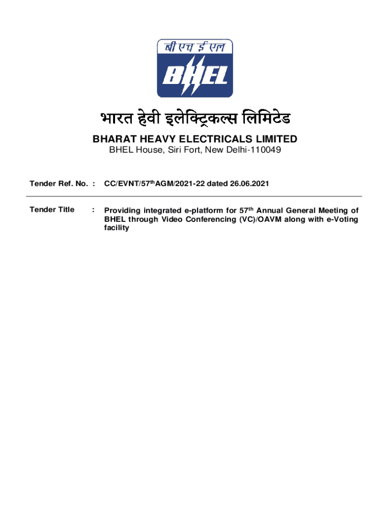BHARAT HEAVY ELECTRICAL LIMITED BAEL House, Siri Fort, New Delhi110049Tender Ref. No. CC/EVENT/57thAGM/202122 dated 26.06.2021Tender TitleProviding integrated platform for 57th Annual General Meeting