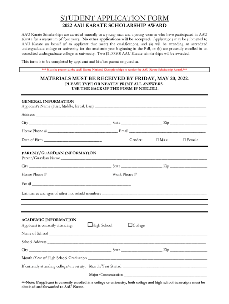 2022 AAU KARATESCHOLARSHIPSTUDENT APPLICATION FORM 2022 AAU KARATE SCHOLARSHIP AWARD AAU Karate Scholarships are awarded annually to a young man and a young woman who have participated in AAU Karate