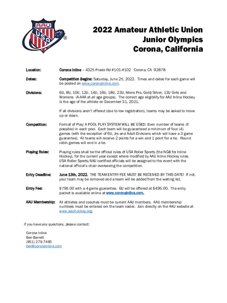 2022 Amateur Athletic Union Junior Olympics Corona, California Location:Corona Inline 4325 Prado Rd #101#102 Corona, CA 92878Dates:Competition Begins: Saturday, June 25, 2022. Times and dates for