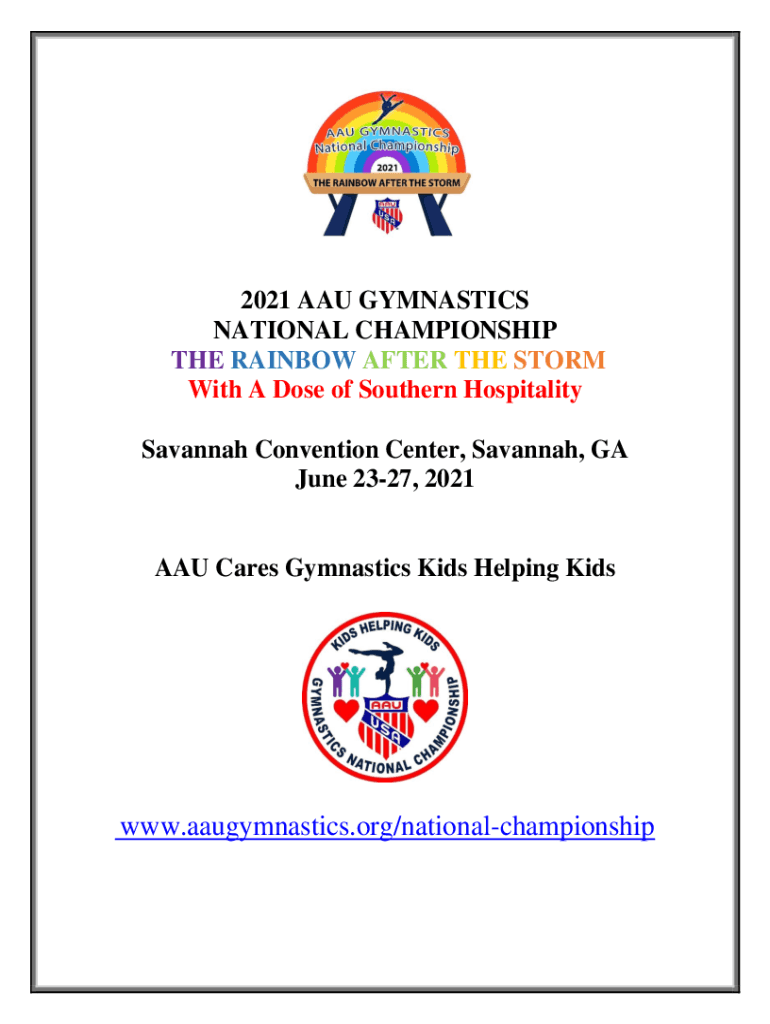 2021 AAU GYMNASTICS NATIONAL CHAMPIONSHIP THE RAINBOW AFTER THE STORM With A Dose of Southern Hospitality Savannah Convention Center, Savannah, GA June 2327, 2021AAU Cares Gymnastics Kids Helping
