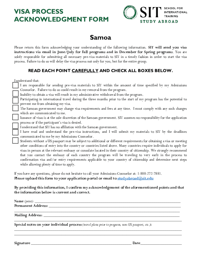 VISA PROCESS ACKNOWLEDGMENT FORM Samoa Please return this form acknowledging your understanding of the following information. SIT will send you visa instructions via email in June/July for Fall programs