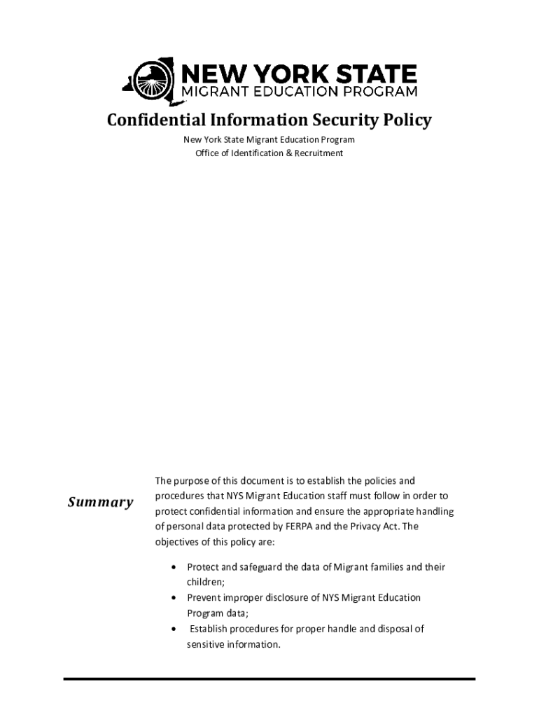 Confidential Information Security Policy New York State Migrant Education Program Office of Identification & RecruitmentSummaryThe purpose of this document is to establish the policies and procedures