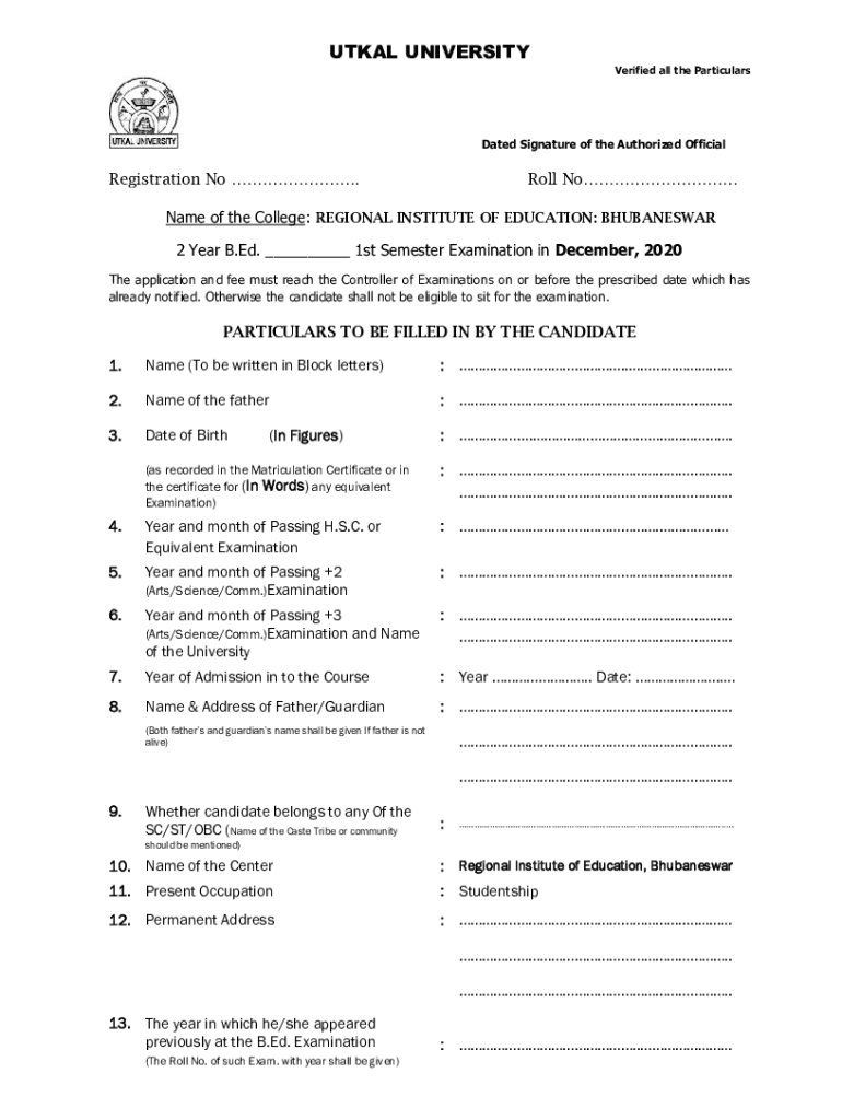 UT KAL UNIVERSITY Verified all the ParticularsDated Signature of the Authorized OfficialRegistration No. Roll Nonage of the College: REGIONAL INSTITUTE OF EDUCATION: BHUBANESWAR 2 Year B. Ed. ___