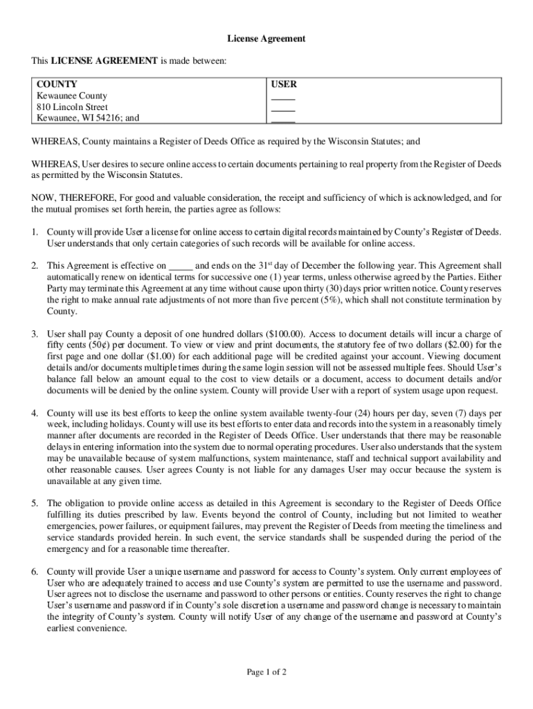 License Agreement This LICENSE AGREEMENT is made between: COUNTY Detainee County 810 Lincoln Street Detainee, WI 54216; andUSERWHEREAS, County maintains a Register of Deeds Office as required by the
