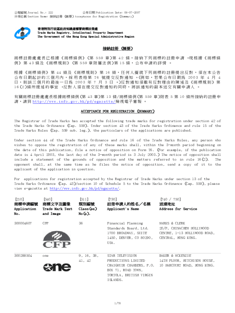 Journal No.: 222 Publication Date: 06072007 Section Name: () Acceptance for Registration (Summary) trademarks Registry, Intellectual Property Department The Government of the Hong Kong Special Administrative