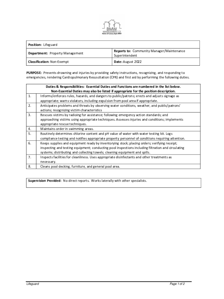 SuperintendentClassification: NonExemptDate: August 2022PURPOSE: Prevents drowning and injuries by providing