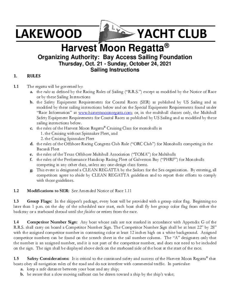 LAKEWOODYACHT CLUBHarvest Moon Regatta Organizing Authority: Bay Access Sailing Foundation Thursday, Oct. 21 Sunday, October 24, 2021, Sailing Instructions 1.RULES1.1The regatta will be governed by:
