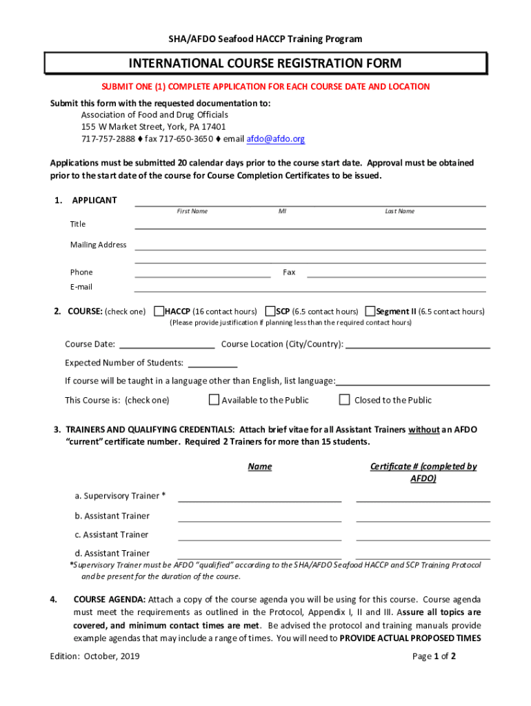 SHA/AFRO Seafood HACCP Training ProgramINTERNATIONAL COURSE REGISTRATION FORM SUBMIT ONE (1) COMPLETE APPLICATION FOR EACH COURSE DATE AND LOCATION Submit this form with the requested documentation