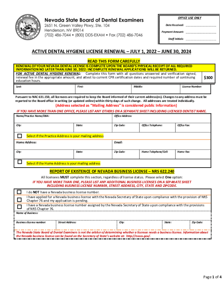 OFFICE USE ONLY Date Received: Payment Amount: Staff Initials:ACTIVE DENTAL HYGIENE LICENSE RENEWAL JULY 1, 2022, JUNE 30, 2024 READ THIS FORM CAREFULLY RENEWAL OF YOUR NEVADA DENTAL LICENSE IS COMPLETE