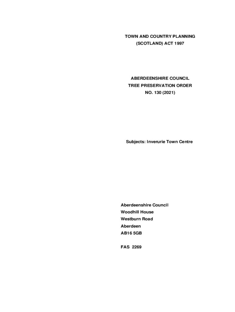 TOWN AND COUNTRY PLANNING (SCOTLAND) ACT 1997ABERDEENSHIRE COUNCIL TREE PRESERVATION ORDER NO. 130 (2021)Subjects: Inverse Town CentreAberdeenshire Council Woodhull House West burn Road Aberdeen AB16