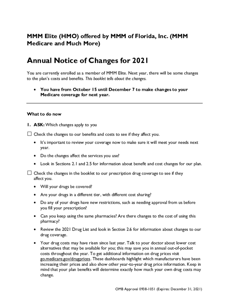 MMM Elite (HMO) offered by MMM of Florida, Inc. (MMM Medicare and Much More)Annual Notice of Changes for 2021 You are currently enrolled as a member of MMM Elite. Next year, there will be some changes