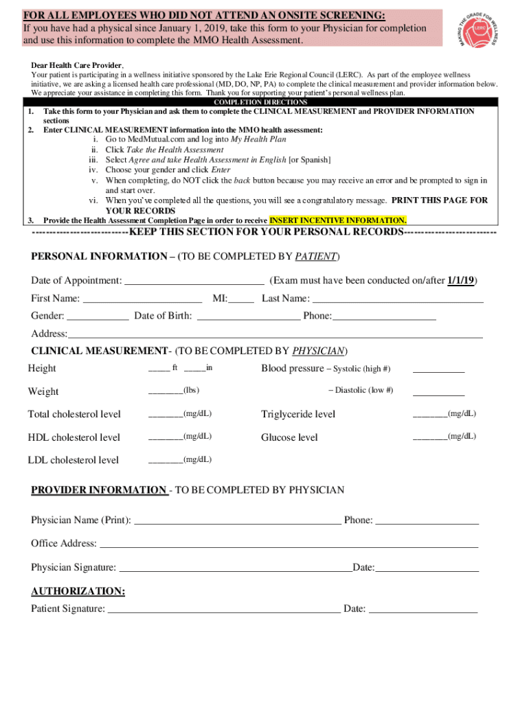 FOR ALL EMPLOYEES WHO DID NOT ATTEND AN ONSITE SCREENING: If you have had a physical since January 1, 2019, take this form to your Physician for completion and use this information to complete the